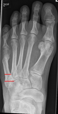 Mellan de röda strecken: ungefärligt läge för Jones-fraktur. Längre proximalt: avulsionsfraktur.
