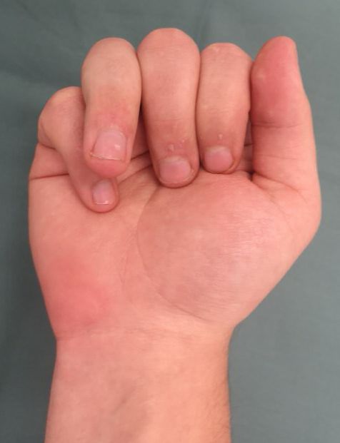 Kontrollera distalstatus och ev. rotationsfelställning. Vid flexion ska fingrarna peka mot skafoideum och inte korsa varandra. Om det inte går att flektera fingrar så ska naglarna ligga rakt dorsalt, och likadant.