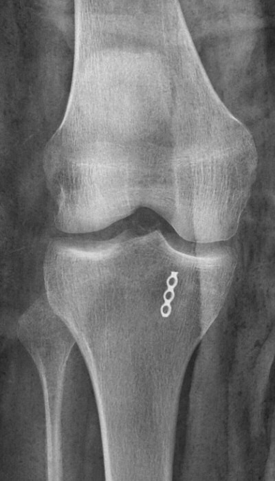 Första bilden eminentiafraktur typ III (och segondfraktur), andra bilden efter operation med sutur.