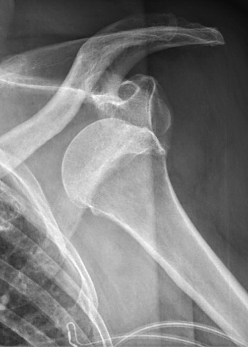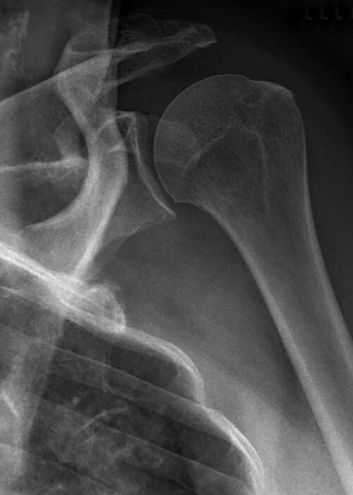 Bakre luxation, patienten hade mycket ont, kunde inte röra axeln alls. På frontalbilden ligger kaput roterat, på sidobild ligger kaput inte rätt i leden, på 3D-rekonstruktion syns felställningen tydligt (delar av nyckelben och akromion bortredigerade).