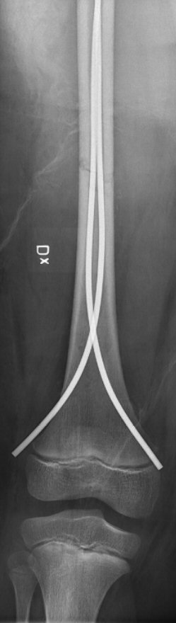 Diafysär femurfraktur, fixerad med två TEN-spikar