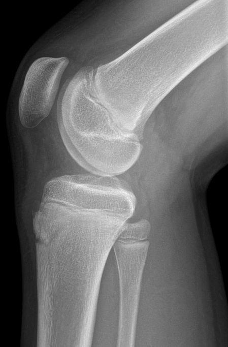 - Slätröntgen med sidobild av knä, kan visa visa benfragment i tuberositas tibiae [1]