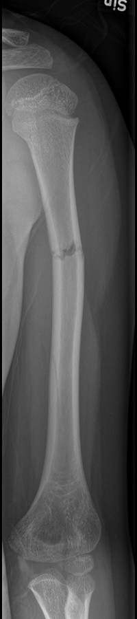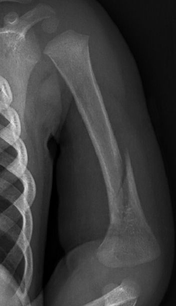 1-årigt barn med diafysär humerusfraktur, fick vadd runt armen och linda runt kroppen i 3 veckor, därefter kliniskt läkt.