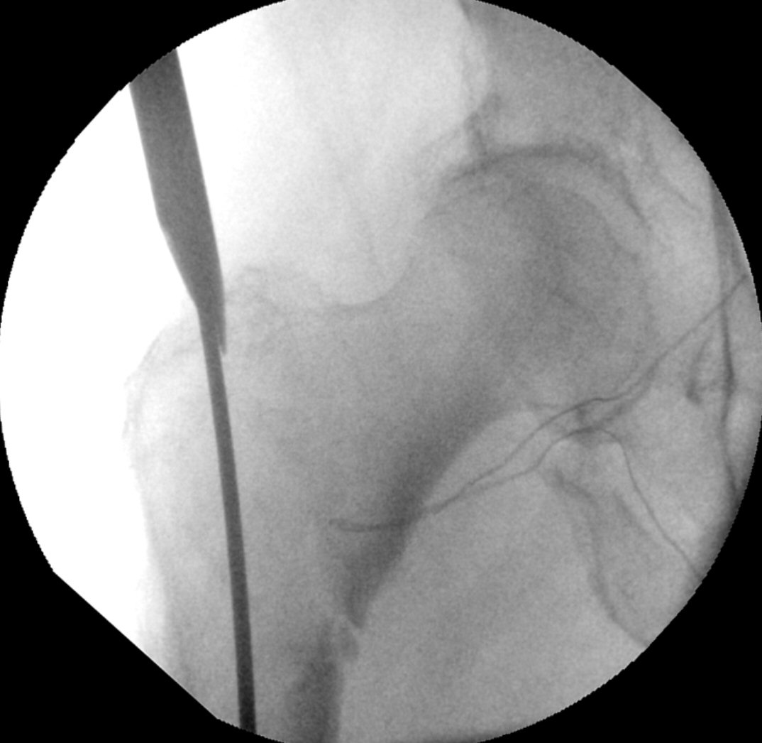 - Borra med guidewire 3,2 mm, sikta på toppen på frontalvyn, och centralt i femur i sidovyn.