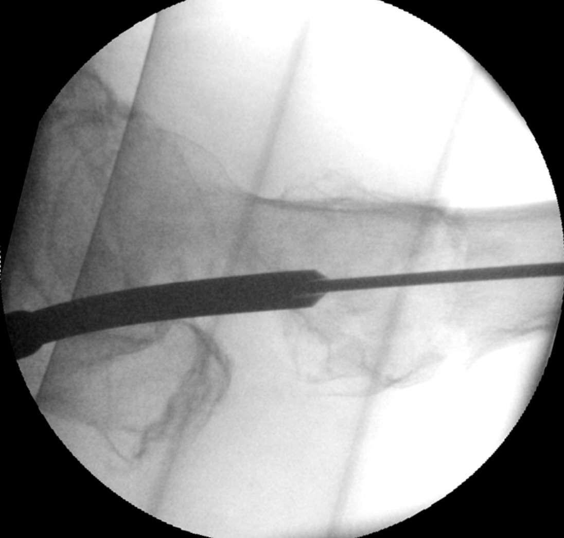 - Kontrollera i genomlysning att guidewirern ligger inne i benet, även distalt.