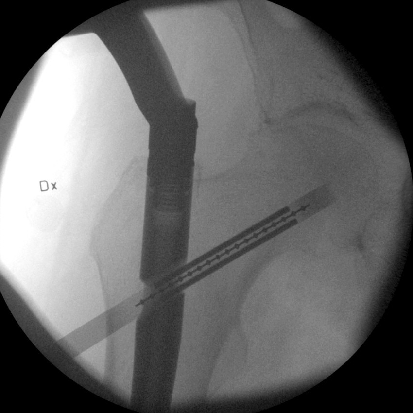 - Skruva in glidskruven, avsluta så handtaget är parallellt eller vinkelrätt mot femur, detta för att set-skruven sedan ska hamna rätt. Notera att man inte får skruva ut glidskruven när man väl börjat skruva in den.