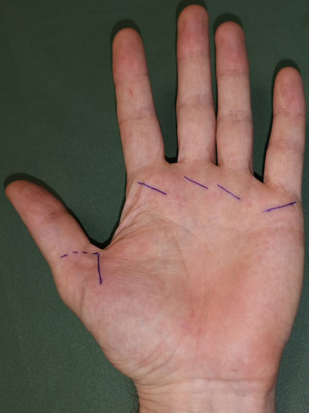 Exempel på snittföring vid operation av triggerfinger/-tumme