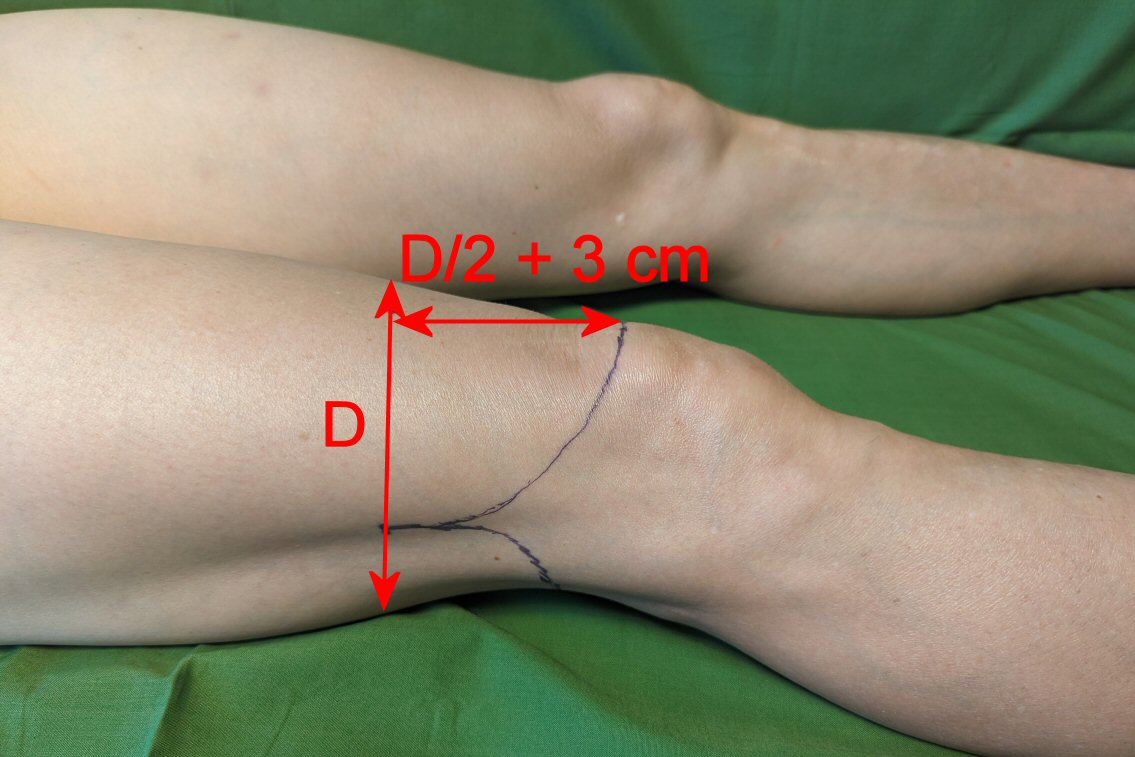 - Markera mitt medialt och mitt lateralt med antal centimeter enligt uträkningen ovan proximalt om distala markeringen, där kommer osteotomin att göras och i denna nivå börjar incisionen. Det brukar vara cirka 10 cm proximalt om knäets rotationscentrum.