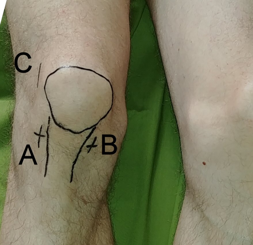 - Identifiera softspot lateralt om proximala polen av patella (portal C). Markera med penna. Punktera vid behov här för odling innan artoskopi.