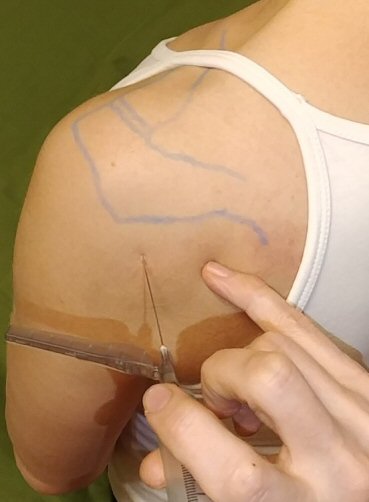 - Identifiera akromions laterala/dorsala hörn, ca 2 cm snett dorsalt/medialt/inferiort om detta finns en "soft spot", där insticket ska ske. Markera platsen med penna med spetsen indragen.