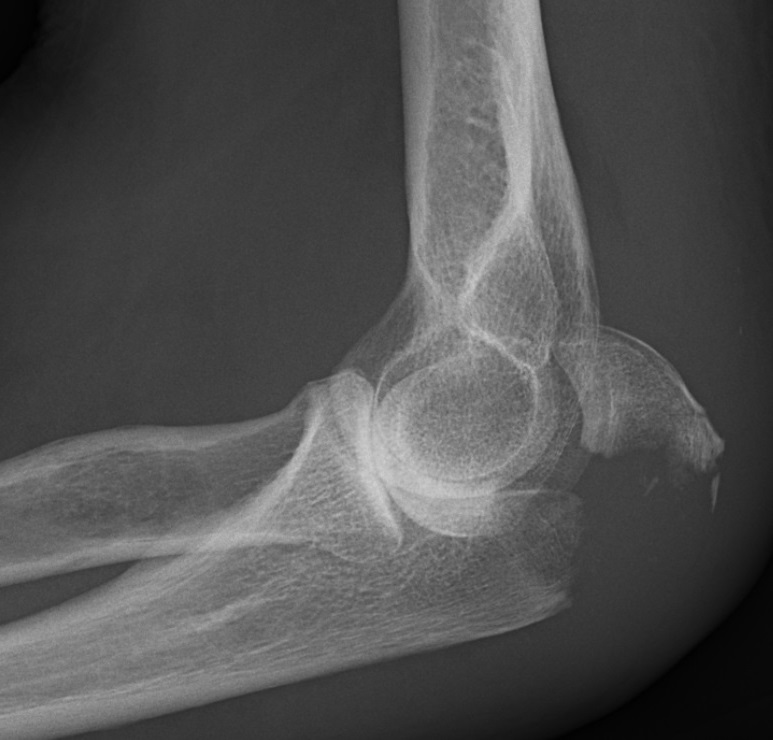 - Mayo typ 2: Sätt hög gipsskena och förbered operation. Behandlas kirurgiskt med reposition och fixation av fragmenten samt re-fixation av triceps.