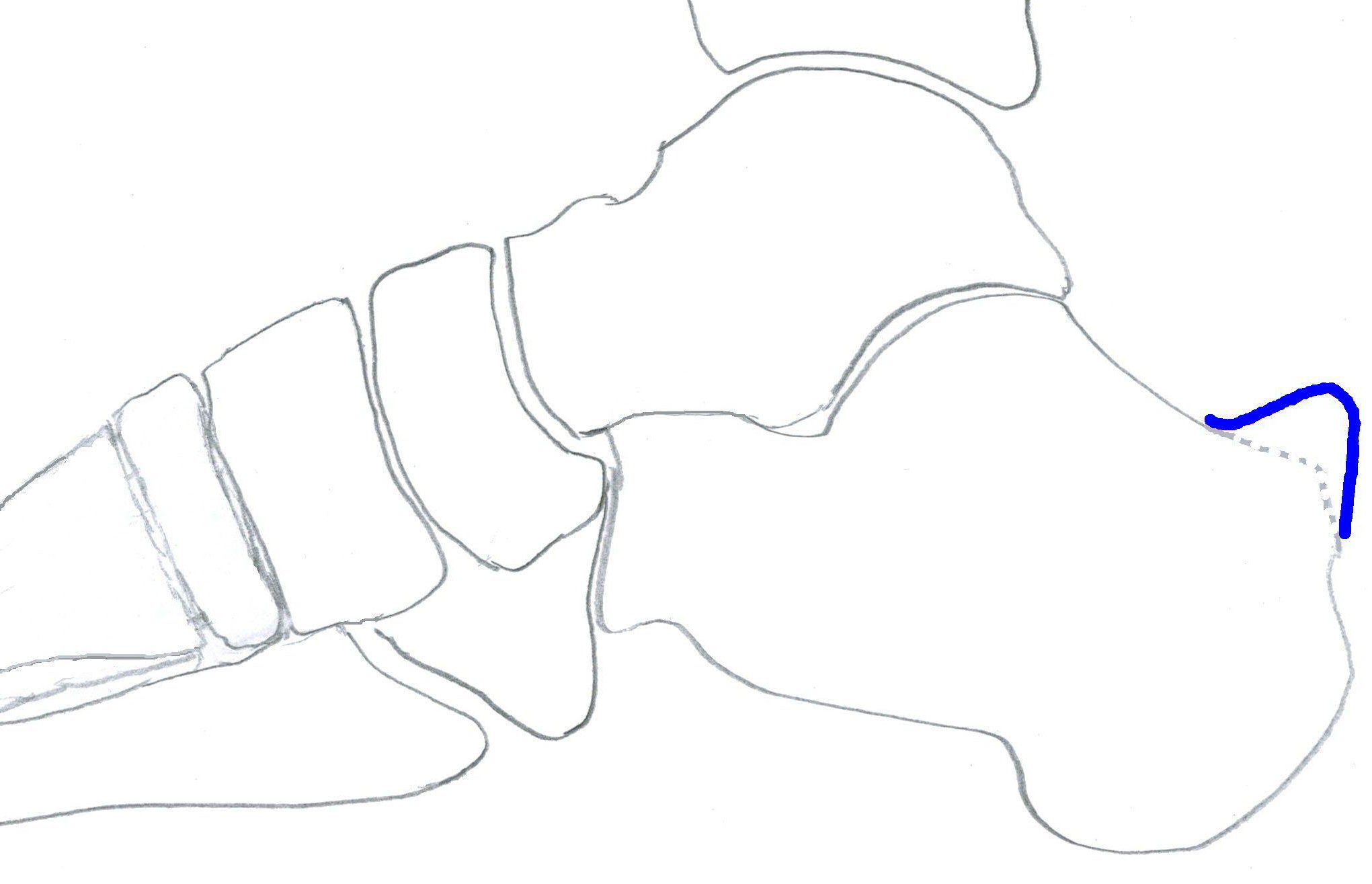 Haglunds deformitet markerat med blått på i övrigt normal fot