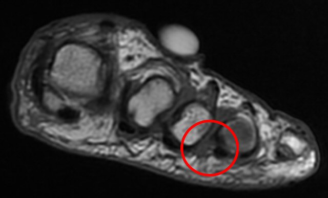 T1-viktad MR-bild med mortons neurom mellan metatarsaler 3 och 4