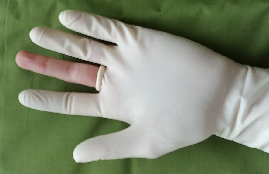 - Klippa av ett finger på steril handske, vira det hårt runt basen på fingret och lås fast med peang