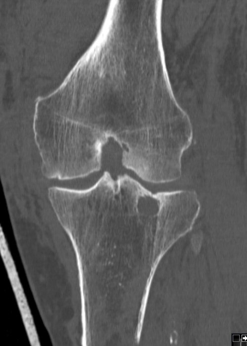Till vänster exempel på odislocerad fraktur i laterala tibiakondylen, behandlad icke-kirurgiskt. Högra bilden efter 2 år, börjat utveckla artros.