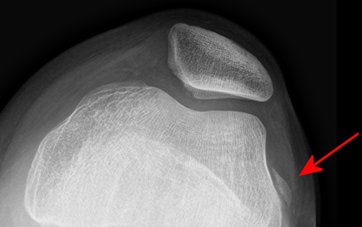 Slätröntgenbild där man kan se avlöst fragment som kommer från mediala patella. MR visade ca 2 cm osteokondralt fragment, opererades.