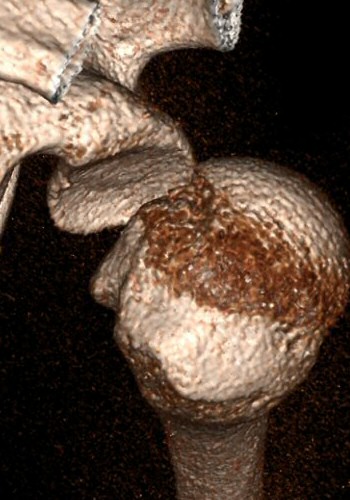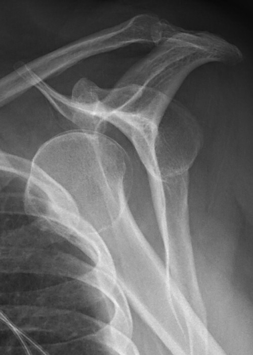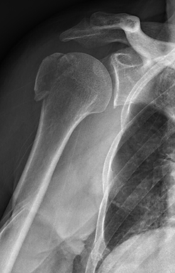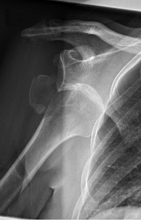 Bakre luxation, patienten hade mycket ont, kunde inte röra axeln alls. På frontalbilden ligger kaput roterat, på sidobild ligger kaput inte rätt i leden, på 3D-rekonstruktion syns felställningen tydligt (delar av nyckelben och akromion bortredigerade).