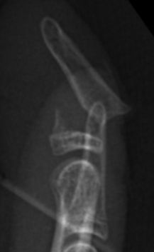- Fyseolysfraktur (Salter-Harris typ I) i distala falangen: