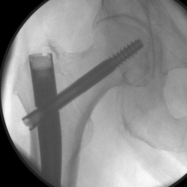 Ibland disloceras frakturen när man skruvar in glidskruven (kaput kan roteras), kontrollera och åtgärda vid behov, t.ex. genom att vrida tillbaka något. Kontrollera läget i genomlysning, det ska vara 0,5-1 cm till kaputs kortikala kant.