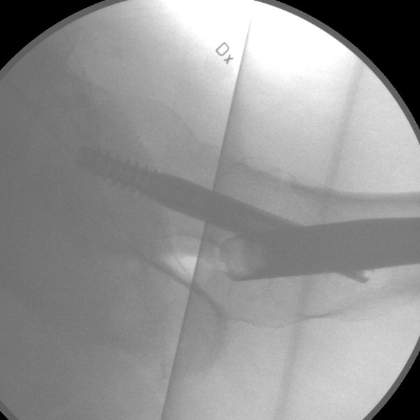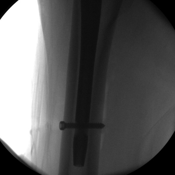 - Skruva in låsskruven, kontrollera läget med genomlysning, den ska gå genom båda kortex.