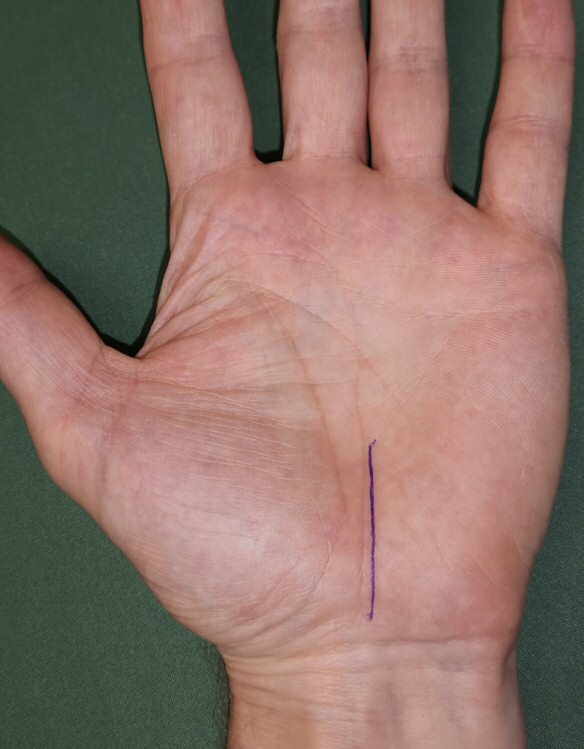 - Markera tänkt snittföring, mellan tenar- och hypotenarmuskulatur, gärna parallellt med ett böjveck, hellre något ulnart än radialt. Sikta ungefär mellan dig 3 och 4.