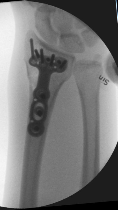 - Lägg plattan på plats. Den ska sitta rakt över radius med distala kanten proximalt om watershed line. Man kan sätta ett eller flera stift för att hålla det på plats.