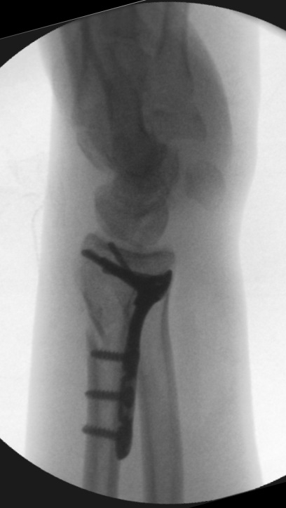 - För in ett eller två stift dorsalt på motsvarande sätt, reponera även dorsalt. Om detta riskerar att volarförskjuta fragmentet kan man först sätta fast den volara plattan proximalt på radius och på så sätt få mothåll. Sätt fast på samma sätt som ovan.