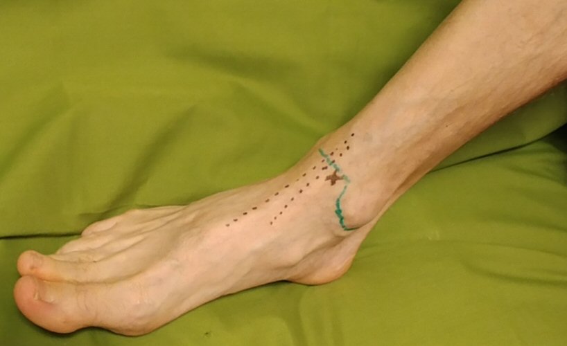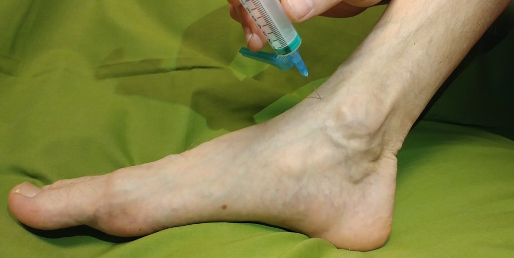 Punktion av fotled, här ej sterilklätt för bättre visualisering