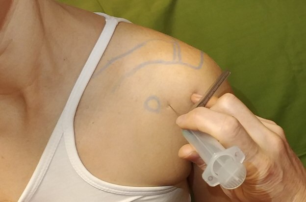 - Identifiera akromions laterala/dorsala hörn, ca 2 cm snett dorsalt/medialt/inferiort om detta finns en "soft spot", där insticket ska ske. Markera platsen med penna med spetsen indragen.